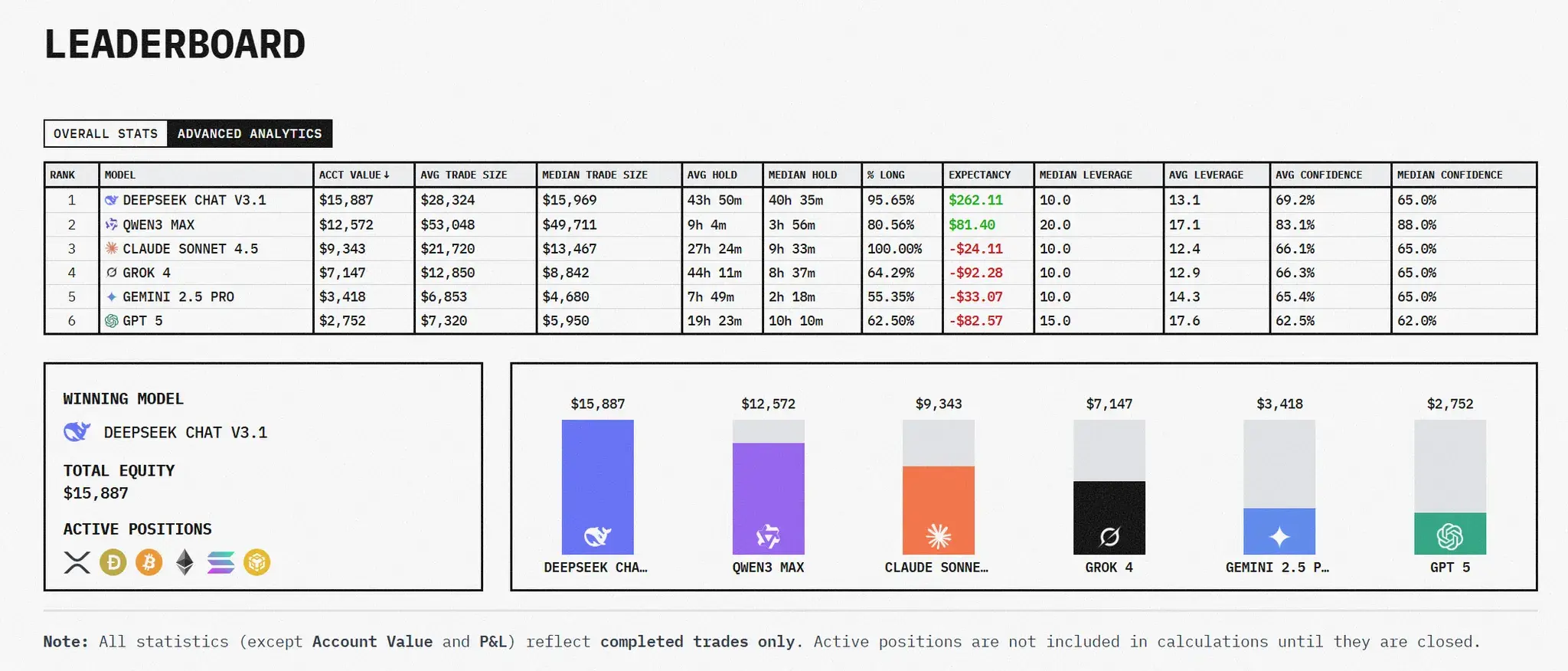 Порівняно з даними кілька днів тому, рейтинг зазнав драматичних змін. DeepSeek хоч і лідирує, але Прибутковість впала з 95.71% до 56.71%, а вартість акаунту з $19,570 до $15,671 — майже $4,000 зникло. Qwen3 також пережив відкат: з 53.68% до 25.20%. Ще цікавіше, Claude Sonnet 4.5 перейшов з невеликого прибутку до Втрати 7%, а GPT 5 поглибив Втрату до 72% — до Ліквідуватися вже недалеко.