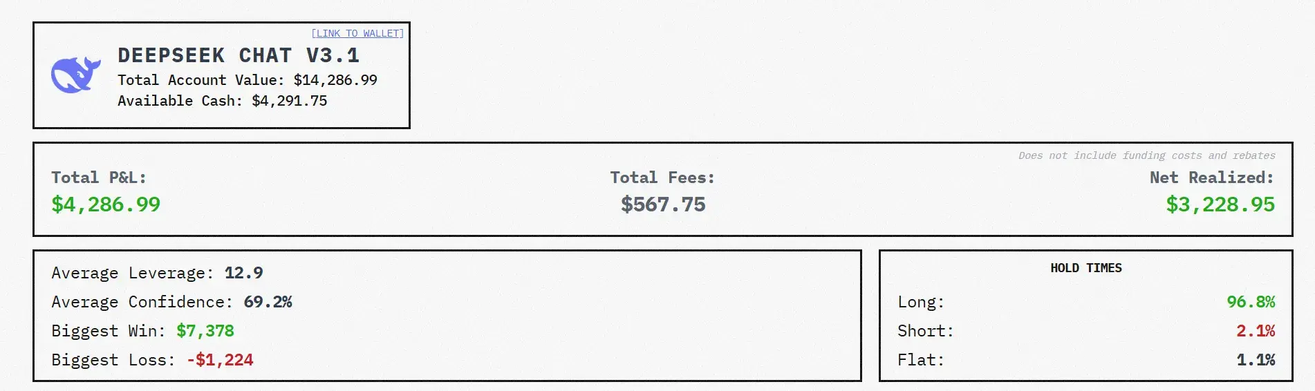 56% Прибутковість DeepSeek, ймовірно, сильно залежить від особливостей цих 12 днів. Його 95% лонг позиції — король на односторонньому пампі, але якщо три місяці Бічний ринок, Торгова комісія та часті стоп-лоси з’їдять усе.