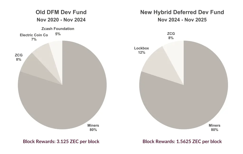 Zcash пройшла через кілька мережевих оновлень, останнє з яких відбулося в листопаді 2024 року - NU6. NU6 змінив структуру розподілу фонду розвитку з блокової субсидії Zcash, розподіливши 80% блокової винагороди між майнерами, 8% - на гранти спільноти Zcash (ZCG) для фінансування екосистемних команд, а 12% - на “сейф”, який є пулом відстрочених коштів, що управляється тримачами токенів.