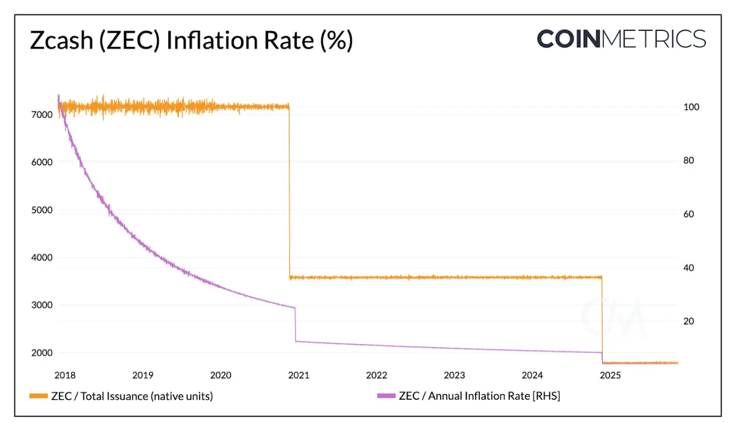 У листопаді 2024 року, після останнього зменшення вдвічі, винагорода за кожен блок зменшиться до 1.5625 ZEC, що призведе до річної інфляції приблизно 4%.