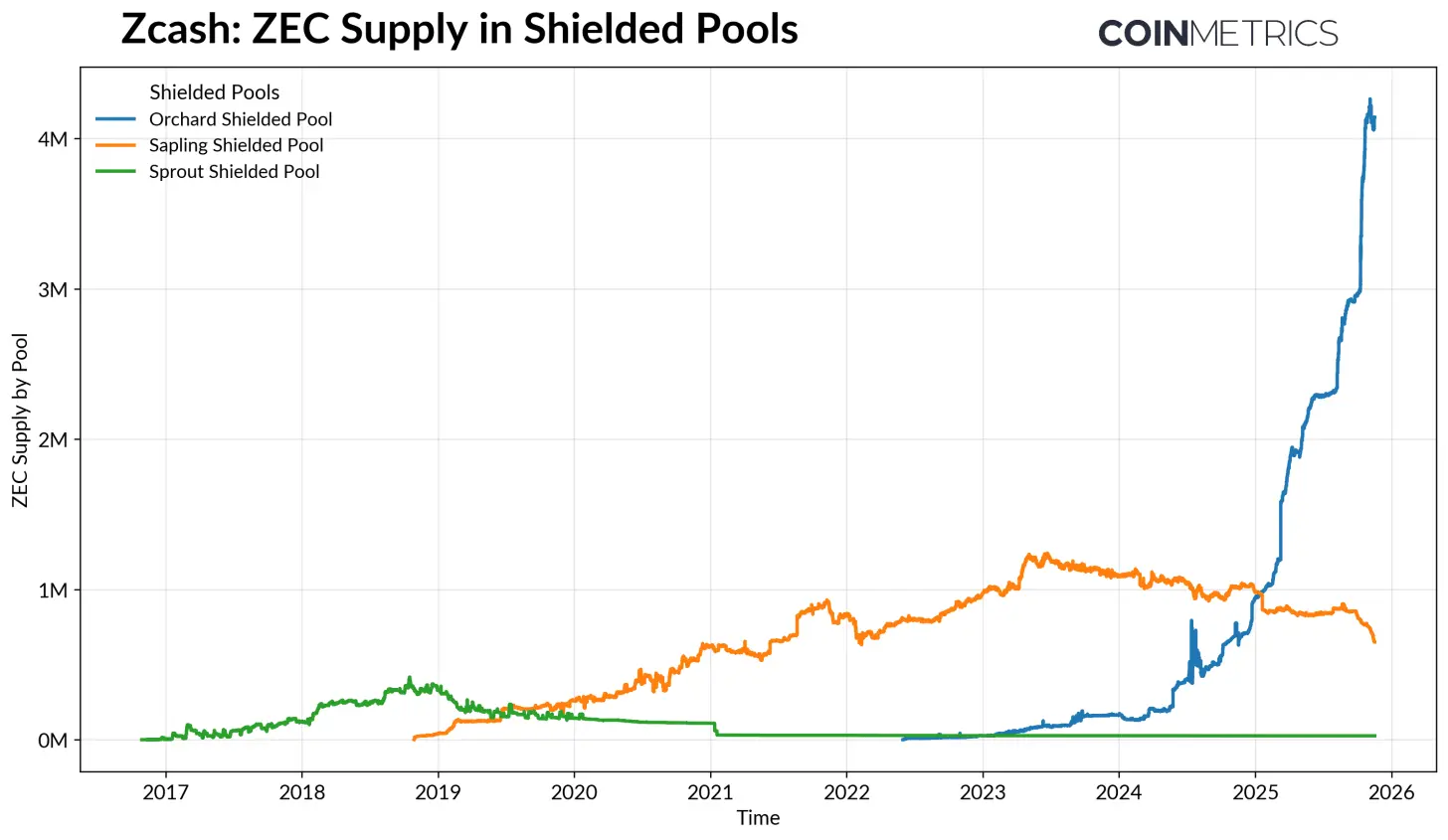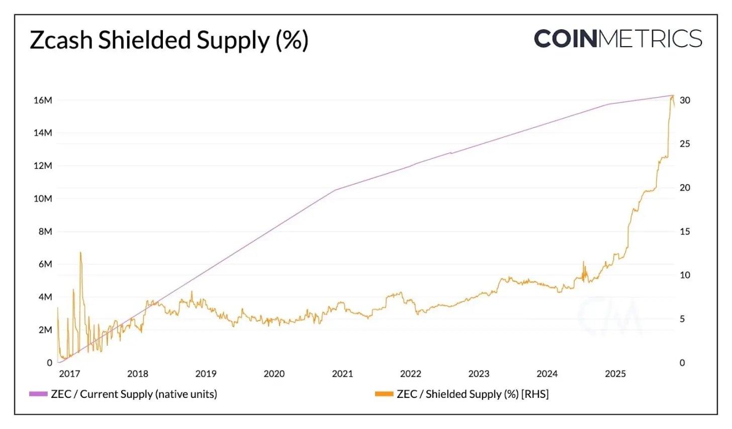Враховуючи це, ми тепер можемо розглянути поширеність діяльності з прихованими транзакціями в блокчейні. Останні дані показують, що використання конфіденційності Zcash значно зросло. Наразі кількість заморожених адрес ZEC зросла до 4,9 мільйона, що становить близько 30% від поточного обсягу, тоді як на початку 2025 року цей показник становив лише 11%. Це свідчить про те, що значна частина власників ZEC вибирає активувати рівень конфіденційності, а не повну прозорість. Більший пул анонімності також розширює межі анонімності, що означає, що з ростом кількості ZEC, що зберігаються конфіденційно, ускладнюється відстеження кожної анонімної транзакції.