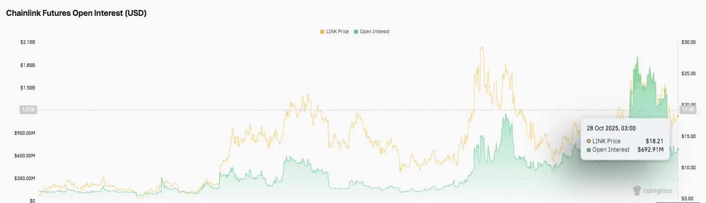 Згідно з даними станом на 28 жовтня, відкритий інтерес зріс до 692,91 мільйона доларів, тоді як LINK торгується приблизно по 18,21 долара. Це представляє собою сильний відскок від рівнів середини року, коли відкритий інтерес впав нижче $400 мільйон.