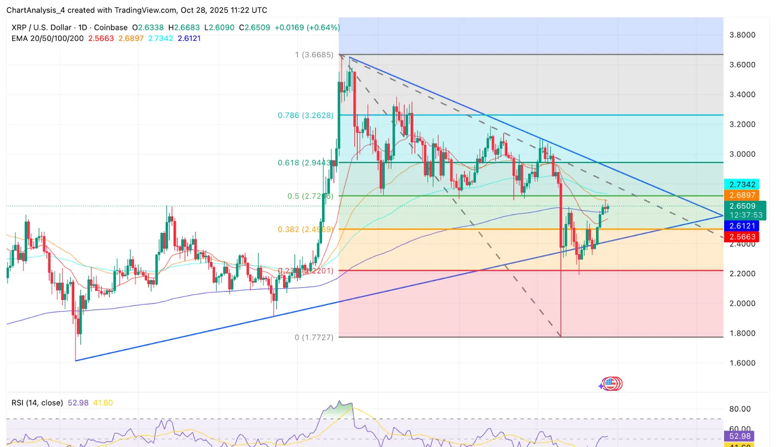 Щоденний графік показує, що XRP намагається відновити рівень корекції Фібоначчі 0.5 на $2.72, ключовий середній показник з літнього ралі до піку $3.66. Токен різко відновився з жовтневого мінімуму біля $2.20, при цьому 20-денна EMA на $2.68 забезпечує точку повороту для покупців.
