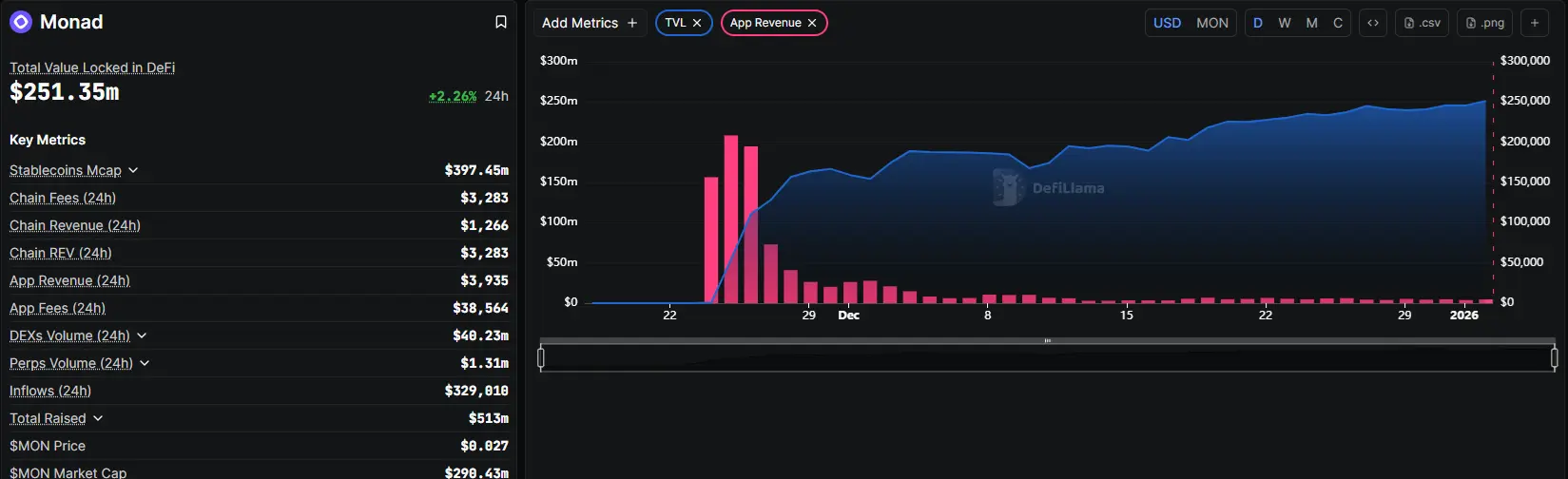 Monad досяг пікового заблокованого значення, хоча доходи від додатків варіюються залежно від стимулів і кампаній. Активність на Monad генерує відносно низькі комісії для операторів вузлів, але додатки набирають обертів. Доходи додатків досягли піку наприкінці 2025 року, з понад $200M у щоденних комісіях. З того часу активність ланцюга знизилася, співпадаючи з загальним слабким торгівлею після свят.