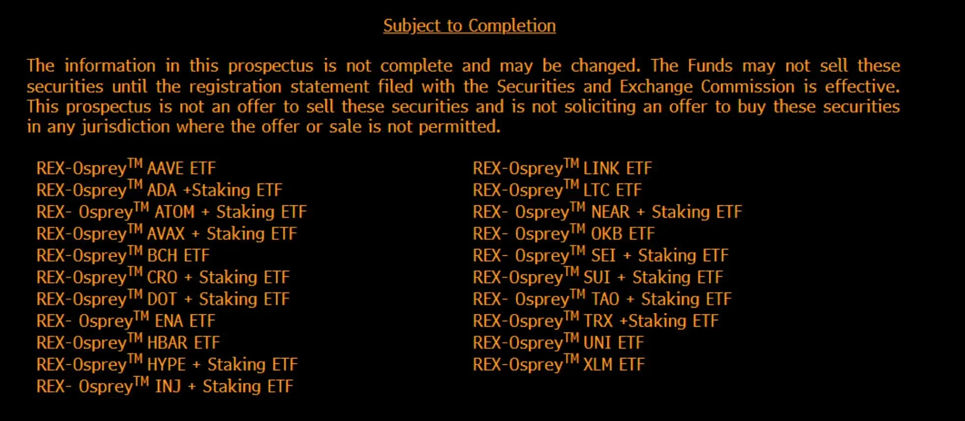 Ngày 3/10, REX-Osprey đã nộp bản cáo bạch cho 21 quỹ ETF tiền điện tử đơn tài sản, gồm AAVE, ADA, ATOM, ENA, trong đó có sản phẩm kèm tính năng staking. Cùng ngày, Defiance cũng nộp hồ sơ cho 6 quỹ ETF đòn bẩy 3x, chia đều giữa vị thế long và short Bitcoin, Ethereum, Solana.