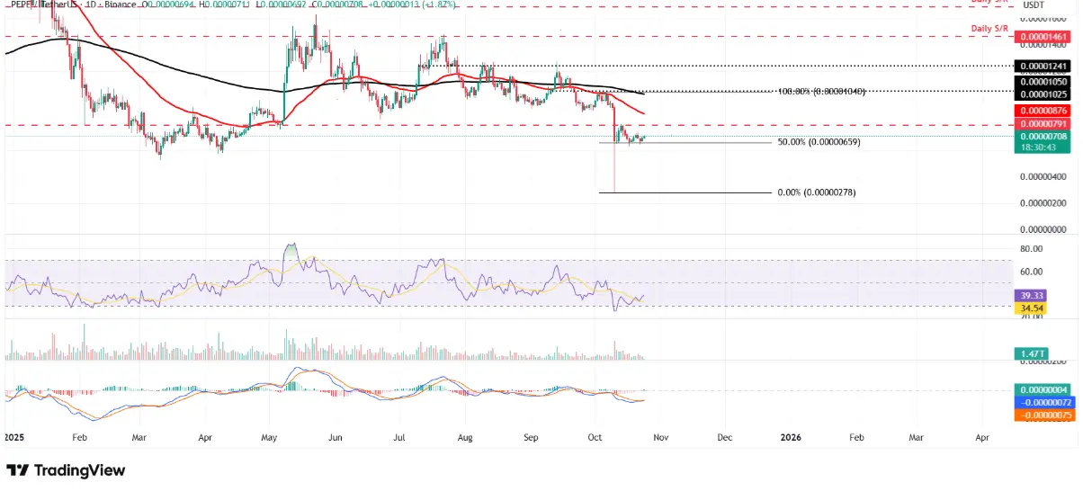 Biểu đồ PEPE/USDT hàng ngày | Nguồn: TradingViewTương tự BONK và FLOKI, các chỉ báo kỹ thuật như RSI và MACD đang cho thấy đà giảm suy yếu rõ rệt, đồng thời phát tín hiệu ủng hộ cho một nhịp phục hồi ngắn hạn. Tuy vậy, trong trường hợp lực bán quay trở lại, vùng 0,0000065 USD vẫn sẽ là mốc hỗ trợ quan trọng cần được bảo vệ.
