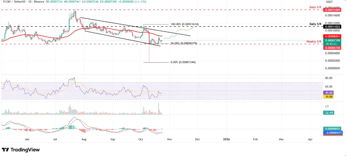 Biểu đồ FLOKI/USDT hàng ngày | Nguồn: TradingViewTrên biểu đồ ngày, chỉ báo RSI hiện ở mức 45 điểm và đang dần hướng lên, cho thấy đà giảm đang suy yếu. Việc RSI vượt ngưỡng 50 sẽ là tín hiệu xác nhận cho một xu hướng tăng bền vững hơn. Bên cạnh đó, MACD cũng vừa ghi nhận giao cắt tăng vào thứ Năm, củng cố tín hiệu mua và hỗ trợ động lực phục hồi.