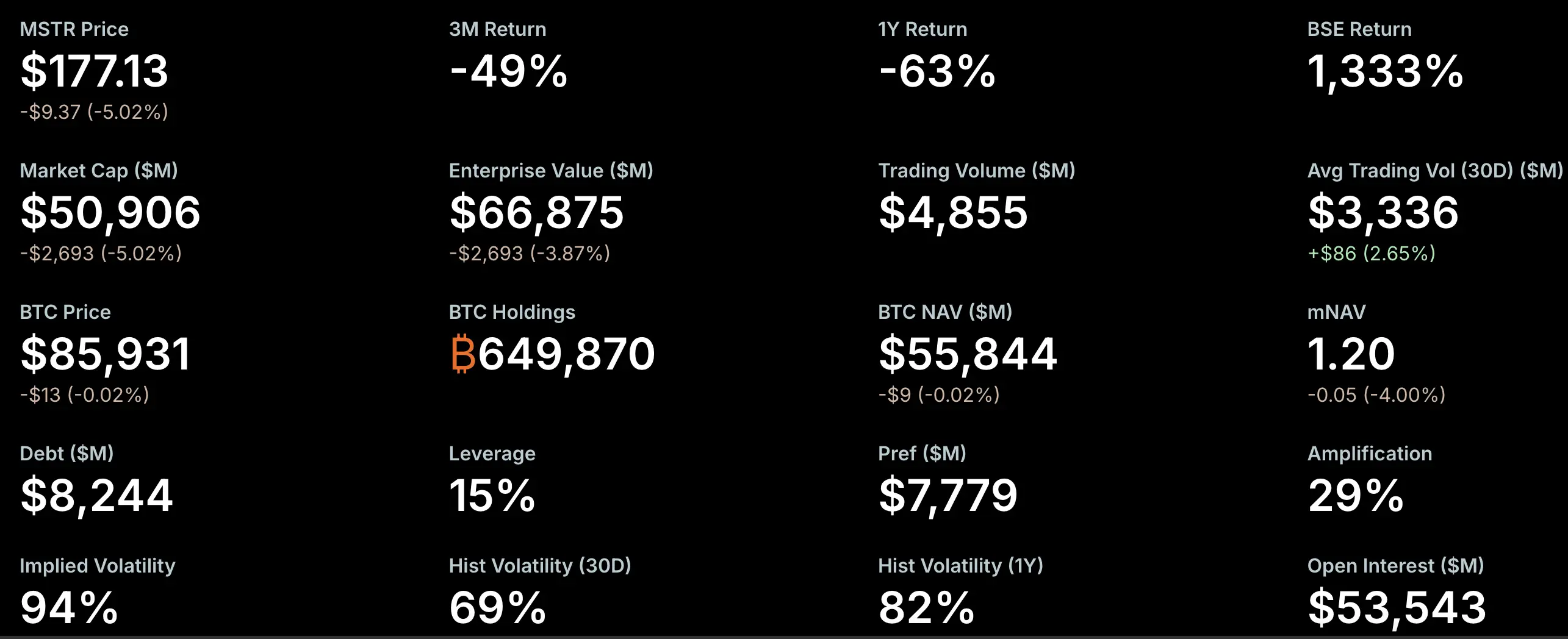 股价表现不佳同样引发市场担忧。StrategyTracker数据显示,截至11月21日,Strategy的MSTR股票总市值约为509亿美元,已低于其持仓的近65万枚比特币(平均持仓成本为74433美元)总市值668.7亿美元,这意味着公司股价出现了“负溢价”。自今年初以来,MSTR股价跌幅已达40.9%。