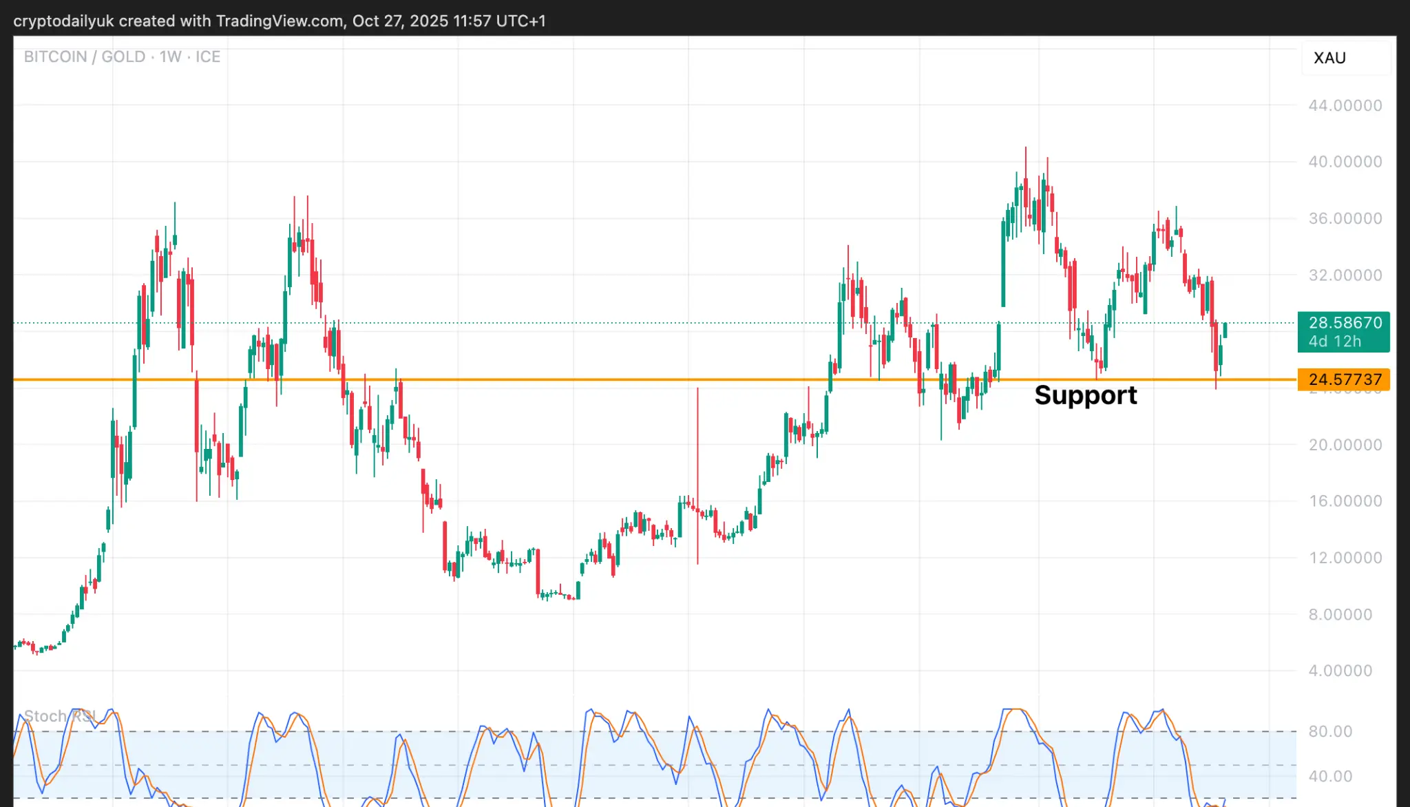 Khi vàng đạt đỉnh của nó, biểu đồ BTC/XAU đã đảo ngược trở lại có lợi cho $BTC. Sự phục hồi mạnh mẽ có thể thấy trong biểu đồ ở trên. Để cho $BTC vượt qua mức cao so với vàng, tỷ lệ trước tiên phải tạo ra một mức cao hơn khoảng 37 ounce, tương ứng với hai đỉnh vào năm 2021. Nếu mức cao nhất mọi thời đại 41 ounce được vượt qua, một mức cao hơn vĩ mô sẽ được tạo ra và Bitcoin sẽ quay trở lại vị thế thăng hoa. Chỉ báo Stochastic RSI cho các khung thời gian hàng tuần và 2 tuần đang ở mức đáy sẵn sàng cung cấp động lực giá tăng cần thiết.
