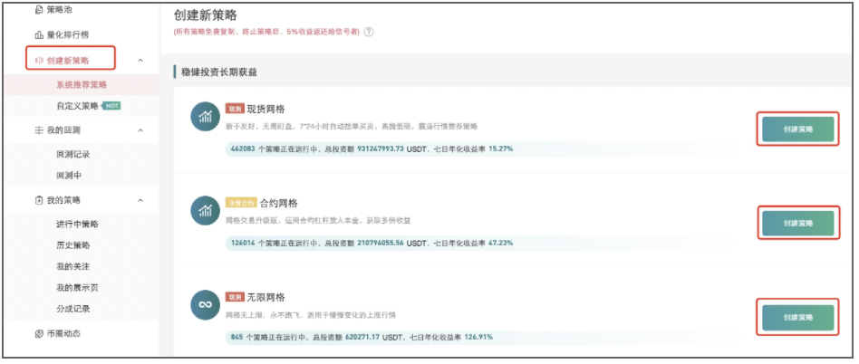 活动期间,用户通过系统推荐策略中的【现货网格】、【合约网格】、【无限网格】中的任意一种创建策略,投入不少于1000USDT的总金额,并使策略总时间在12小时以上,即可参与瓜分10000美元点卡的奖励。