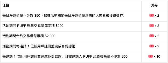 4、本活動獎勵為 PUFF,總獎池為 191,519 PUFF。用戶活動期間需完成任意 PUFF 現貨交易量,才可參與瓜分獎券獎池。獎勵將於活動結束後 14 個工作日內發放至獲獎者錢包賬戶中,可在「錢包—賬單」中查看。獎勵分發公告可在 Gate News 頻道查看。