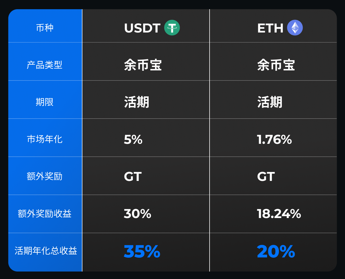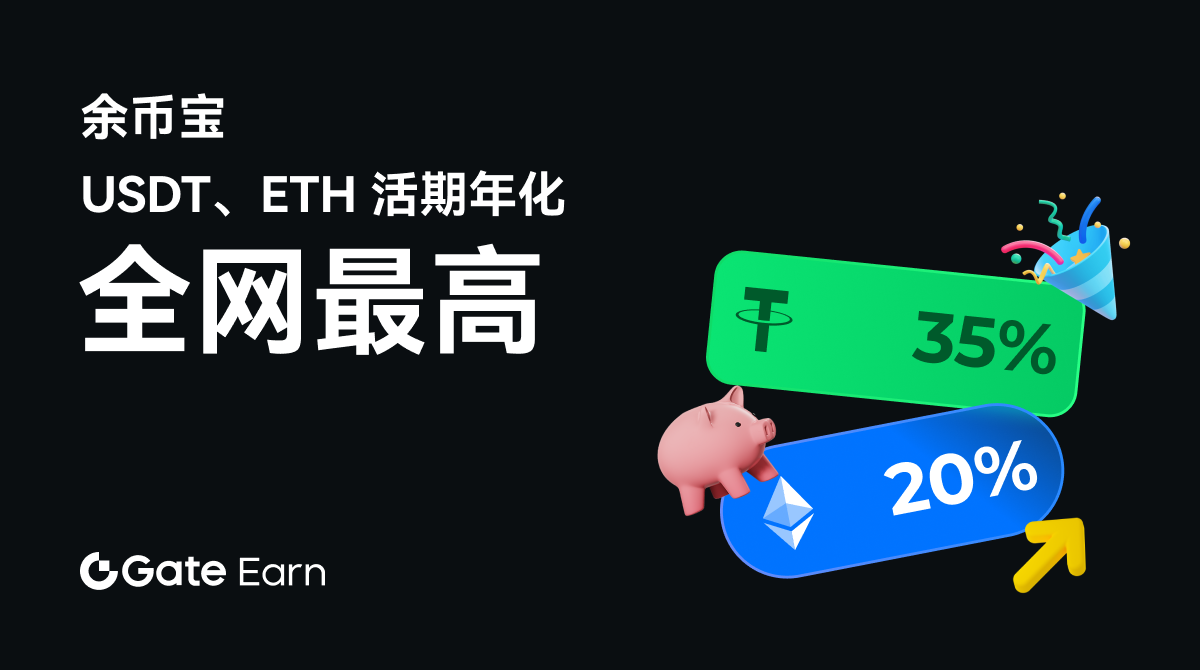 Gate 餘幣寶 USDT、ETH 額外獎勵再升級,USDT 活期年化高達 35%,ETH 活期年化高達 20%,利率穩居全網最高。餘幣寶活期產品隨存隨取,閒置資產也能賺取高收益。