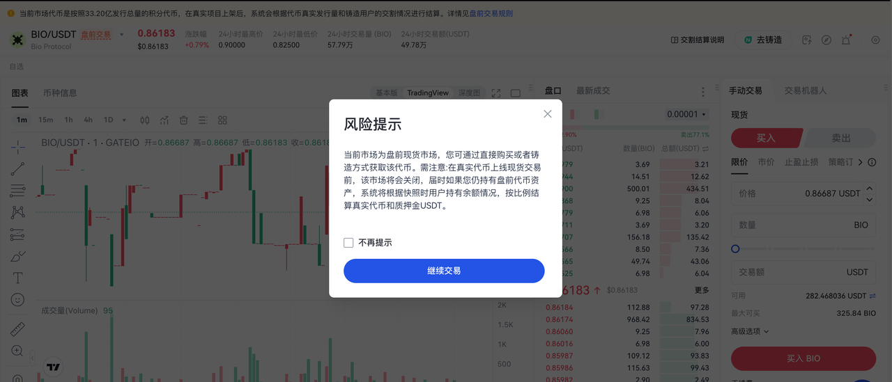 - 風險提醒:在進入盤前交易前,平台已向用戶提示交割相關風險,明確指出交割時按照快照餘額按比例分配真實代幣和違約金。