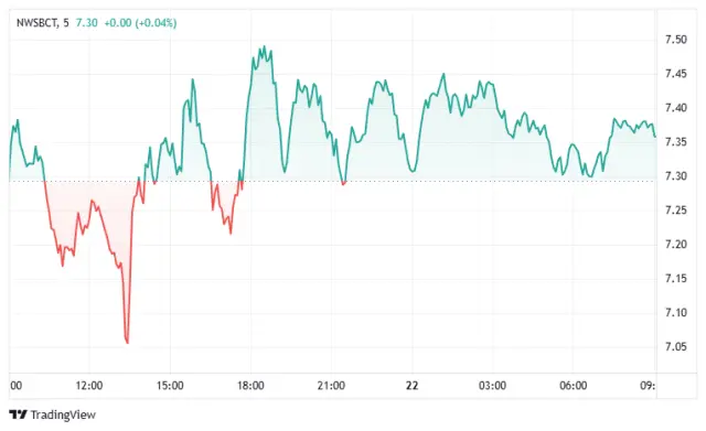 NWSBCT (藍籌指數): NWSBCT指數最初經歷了下滑,但隨後表現出強勁的反彈,穩固在7.30-7.45區間。此後,它顯示出上升的偏向,持續出現高峯和低谷,表明波動但總體積極的動量,維持在7.30以上。