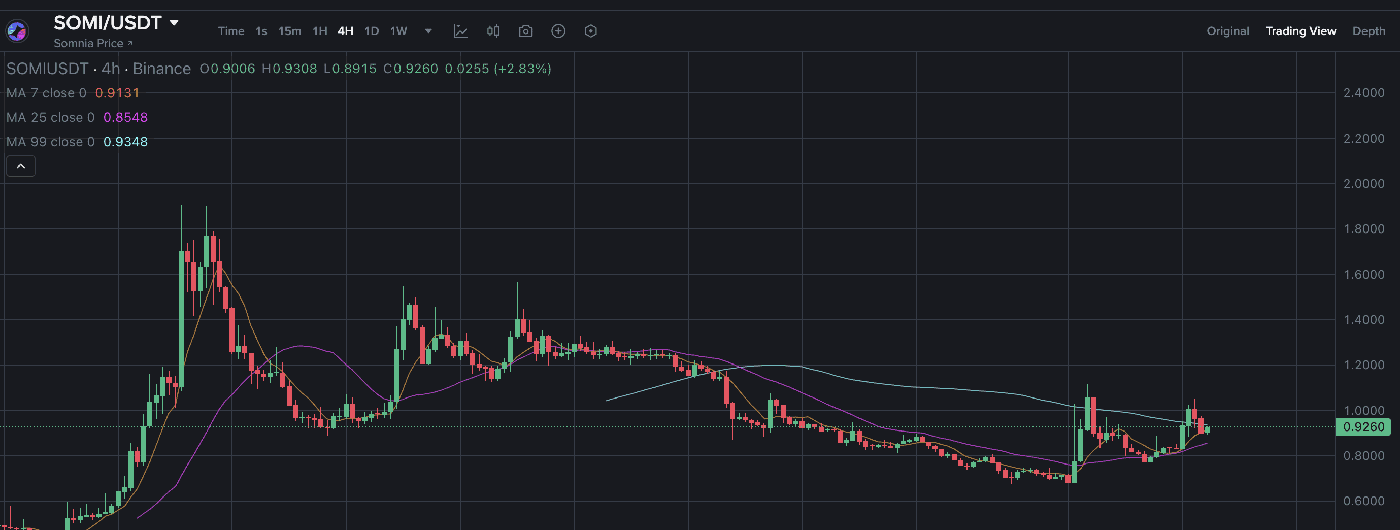 SOMI/USDT 技術分析:關鍵阻力位在 MA 99,潛在目標在 $0.95, $1.10 和 $1.30