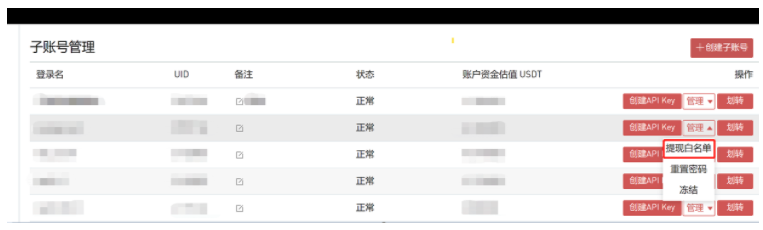 步骤三:子账号添加成功后,点击“管理-提现白名单”进行账号管理