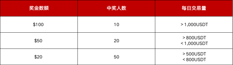 活动期间,参与永续合约交易(买入+卖出)且每日交易量≥500USDT的用户,即可获得抽奖资格。我们将在符合条件的用户中随机抽取80名用户瓜分$3,000。奖金数额、中奖人数和交易量如下: