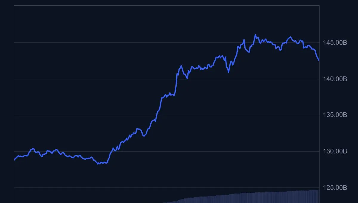 值得注意的是上涨的速度。市值从低$120B 区间加速至超过$140B ,在压缩的时间框架内,表明需求持续而非短暂的投机性爆发。尽管在峰值后出现了小幅回调,但结构依然完好,日内图表上的低点更高,保持上升趋势。