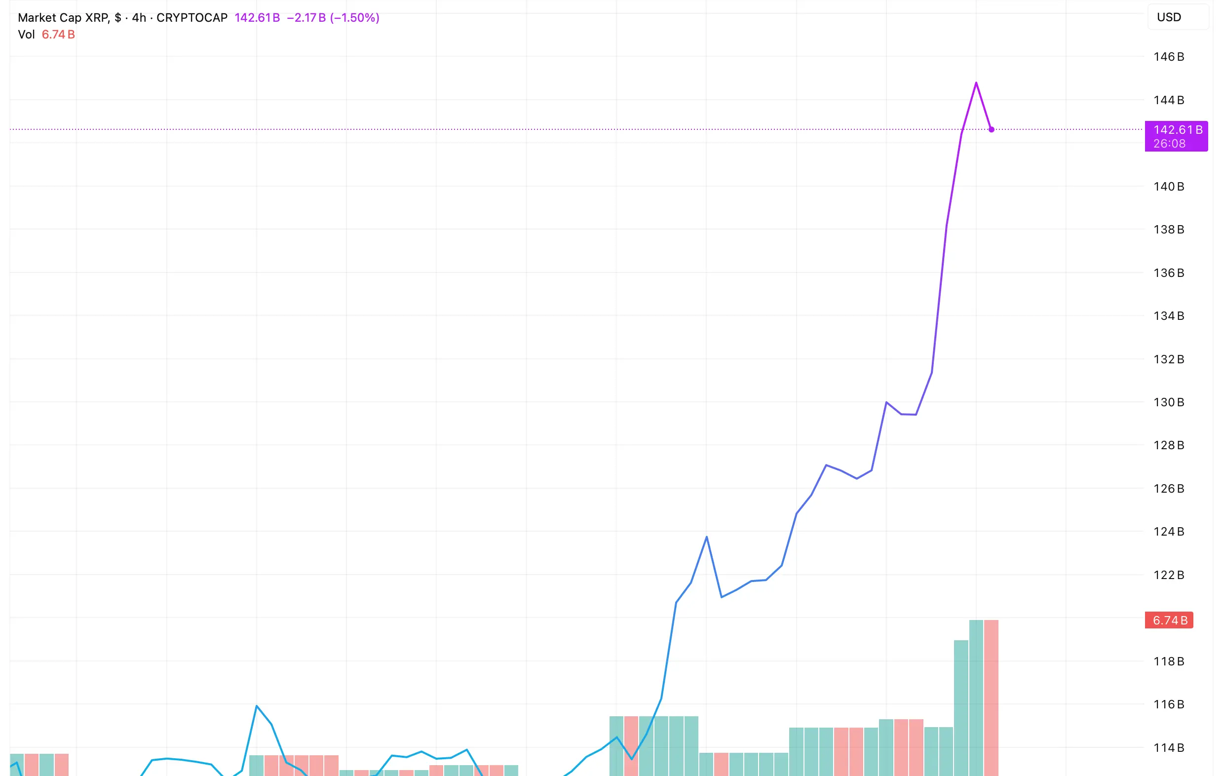 最新数据显示,XRP的市值迅速攀升至$142 十亿,经过几轮交易后呈现几乎垂直的上涨。这一扩张伴随着74亿美元的高交易量,确认此次涨势由流动性支撑,而非薄弱的订单簿。