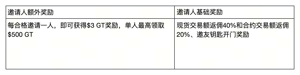 本次活动的GT奖励是在邀请好友的交易返佣和邀友钥匙开门奖励基础上的额外奖励。 邀请人的基础交易返佣奖励为:20%的合约交易额返佣。