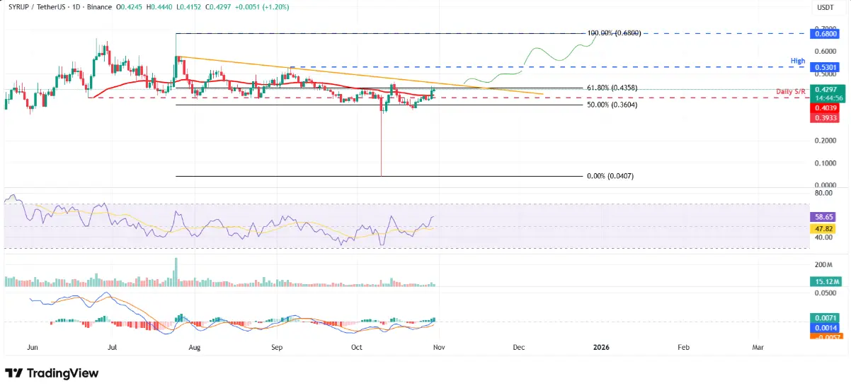 إذا تجاوزت SYRUP وأغلقت فوق مستوى تصحيح فيبوناتشي 61.8% عند 0.43 USD ( من قمة يوليو عند 0.68 USD إلى قاع أكتوبر عند 0.04 USD) على الرسم البياني اليومي، فمن المحتمل أن يستمر الزخم الصعودي نحو المستوى العالي في 6/9 عند 0.53 USD. قد يفتح النجاح في التغلب على هذا المستوى أيضًا فرصة نحو قمة 25/7 عند 0.68 USD.