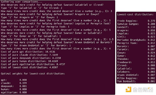 مثال للعبة اللعب البشري لتوزيع الائتمانات ، راجع الكود الخاص بـ Python هنا. يتطلب البرنامج منك أن تكون عضوًا في هيئة المحلفين ويتضمن قائمة كاملة مُضمّنة مسبقًا في الكود تضم توليفة خطية من الإجابات الكاملة التي تحددها الهيئة المحلفة. في هذه الحالة ، الجمع الفائز هو 0.199 * إجابة كلود + 0.801 * إجابة ديبسيك ؛ هذه التوليفة تتوافق أكثر من أي نموذج فردي مع إجابة هيئة المحلفين. ستكون هذه العوامل أيضًا مكافأة للمقدمين.
