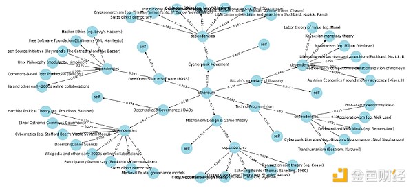 يمكنك بعد ذلك إلقاء نظرة على تأثير هذه العقد في المنبع: حصلت الحكومة الصغيرة الليبرالية والأناركية على 17.3٪ من الفضل في حركة cypherpunk ، ولكن 5٪ فقط للديمقراطية المباشرة في سويسرا.