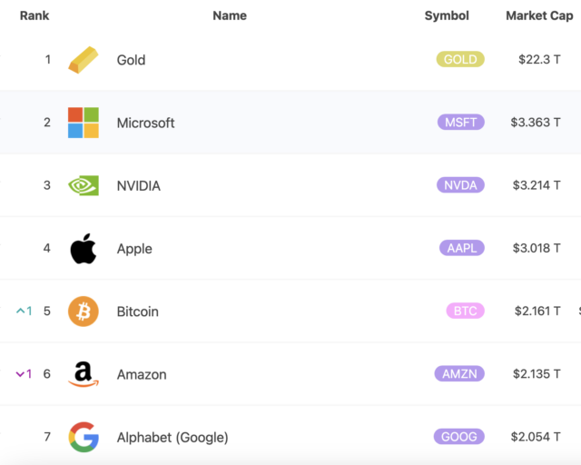 تحتفظ الذهب بالمرتبة الأولى في تصنيف الأصول العالمية بقيمة 22.3 تريليون دولار، تليها مايكروسوفت وNVIDIA وأبل في نطاق يتراوح بين 3 تريليونات و3.36 تريليون دولار. لقد نمت البيتكوين لتظهر وجودها بجانب عمالقة التكنولوجيا التقليديين بعد أن تجاوزت أمازون.