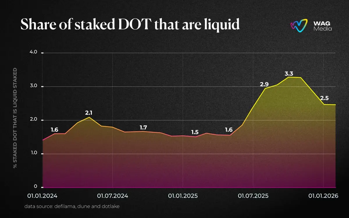 حتى بداية عام 2026، حوالي 2.5% من جميع DOT المجمّدة هي من الستاكينغ السائل، مع ذروة اعتماد تجاوزت 3% في سبتمبر 2025. هذا الارتفاع المستمر يعكس تزايد ثقة المستخدمين — ليس فقط في السعي وراء العوائد، بل في الاستفادة من الفائدة التي يوفرها الستاكينغ السائل.