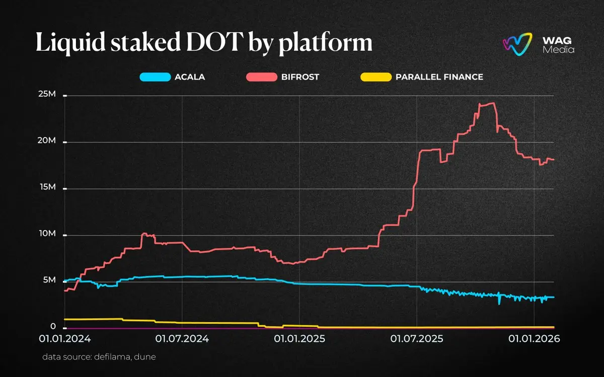 منذ بداية عام 2024، ارتفعت قيمة DOT المجمّدة عبر منصة Bifrost بشكل كبير بنسبة تقارب 400%، ووصلت إلى ذروتها بأكثر من 24 مليون DOT في أكتوبر 2025. هذا النمو الهائل يتناقض بشكل حاد مع منصات أخرى مثل Acala، التي شهدت تقدمًا أبطأ، و Parallel Finance، التي انخفض رصيد الستاكينغ السائل لديها إلى الصفر.