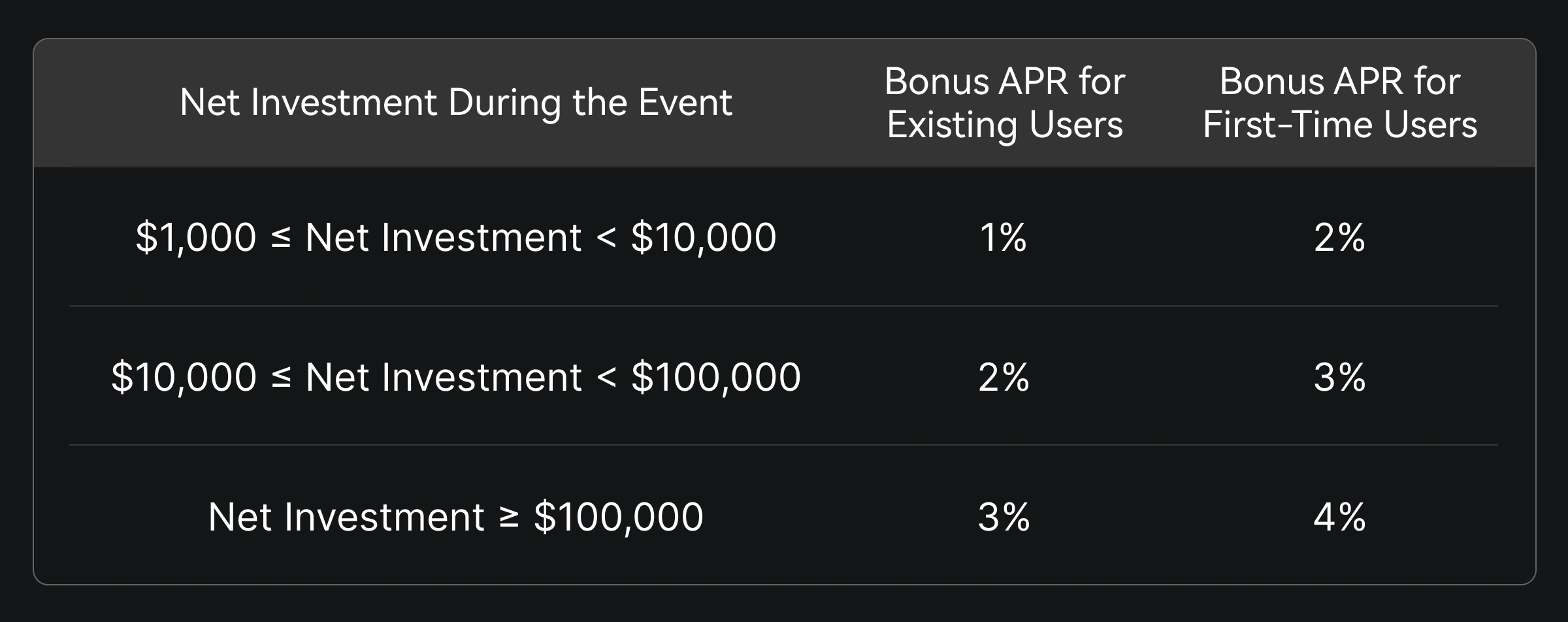 Pendant l'événement, les utilisateurs, nouveaux et existants, peuvent participer à l'investissement à durée déterminée de 7 jours en USDT, BTC ou ETH de Simple Earn et atteindre le montant net d'abonnement spécifié pour bénéficier du TAEG bonus correspondant.