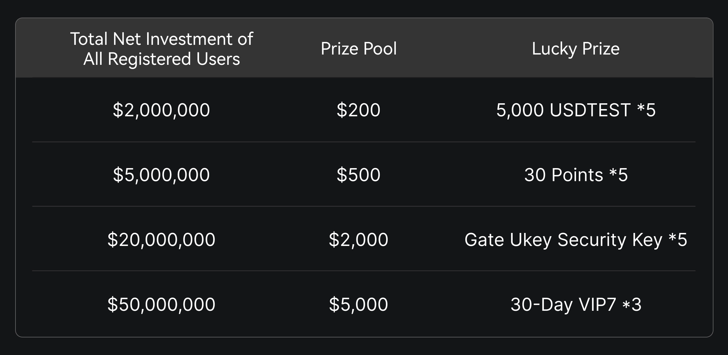 Vous pouvez débloquer la cagnotte correspondante et participer à un tirage au sort basé sur le montant net total des investissements de tous les participants pendant l'événement :