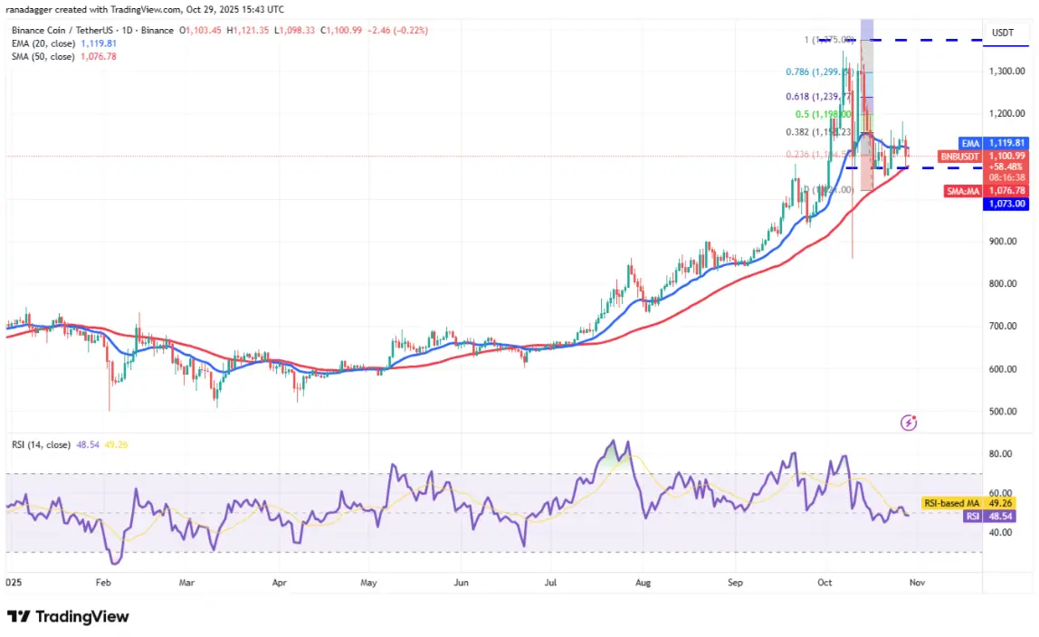 Graphique BNB/USDT journalier | Source : TradingViewLa ligne EMA de 20 jours (1.119 USD) se stabilise et l'indice RSI oscille autour du niveau neutre, indiquant qu'aucun camp ne domine clairement. Si le prix passe en dessous de la ligne SMA de 50 jours, une tendance de correction plus profonde pourrait commencer, visant 1.021 USD, voire 932 USD — signalant que BNB pourrait atteindre un sommet à court terme.