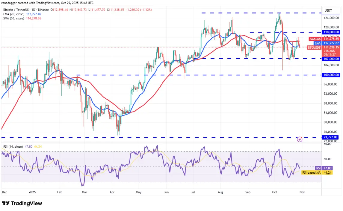 Graphique BTC/USDT quotidien | Source : TradingViewSi le prix de clôture est inférieur à la ligne EMA 20, les baissiers pourraient pousser la paire BTC/USDT vers la zone de support importante à 107.000 USD. Les haussiers devraient défendre fermement ce niveau, car si le seuil de 107.000 USD est franchi, le modèle double sommet (double top) sera confirmé, ce qui pourrait entraîner une forte baisse du prix du BTC vers 100.000 USD.