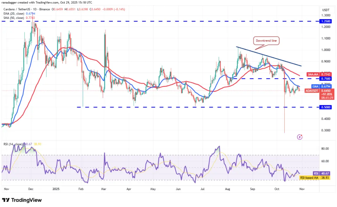Le prix de Cardano (ADA) a commencé à baisser depuis la moyenne mobile exponentielle (EMA) sur 20 jours à 0,68 USD lundi, montrant que le sentiment du marché reste négatif.