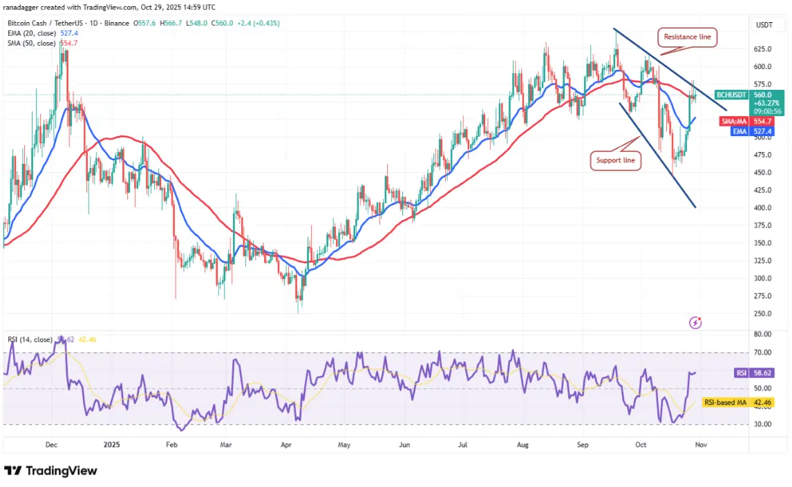 Graphique BCH/USDT quotidien | Source : TradingViewLa ligne EMA de 20 jours est en pente ascendante à 527 USD et l'indice RSI se situe dans la zone positive, indiquant que la tendance actuelle favorise les taureaux. Si le prix de clôture franchit la ligne de résistance, BCH pourrait ouvrir la voie à une augmentation vers 615 USD puis 651 USD.