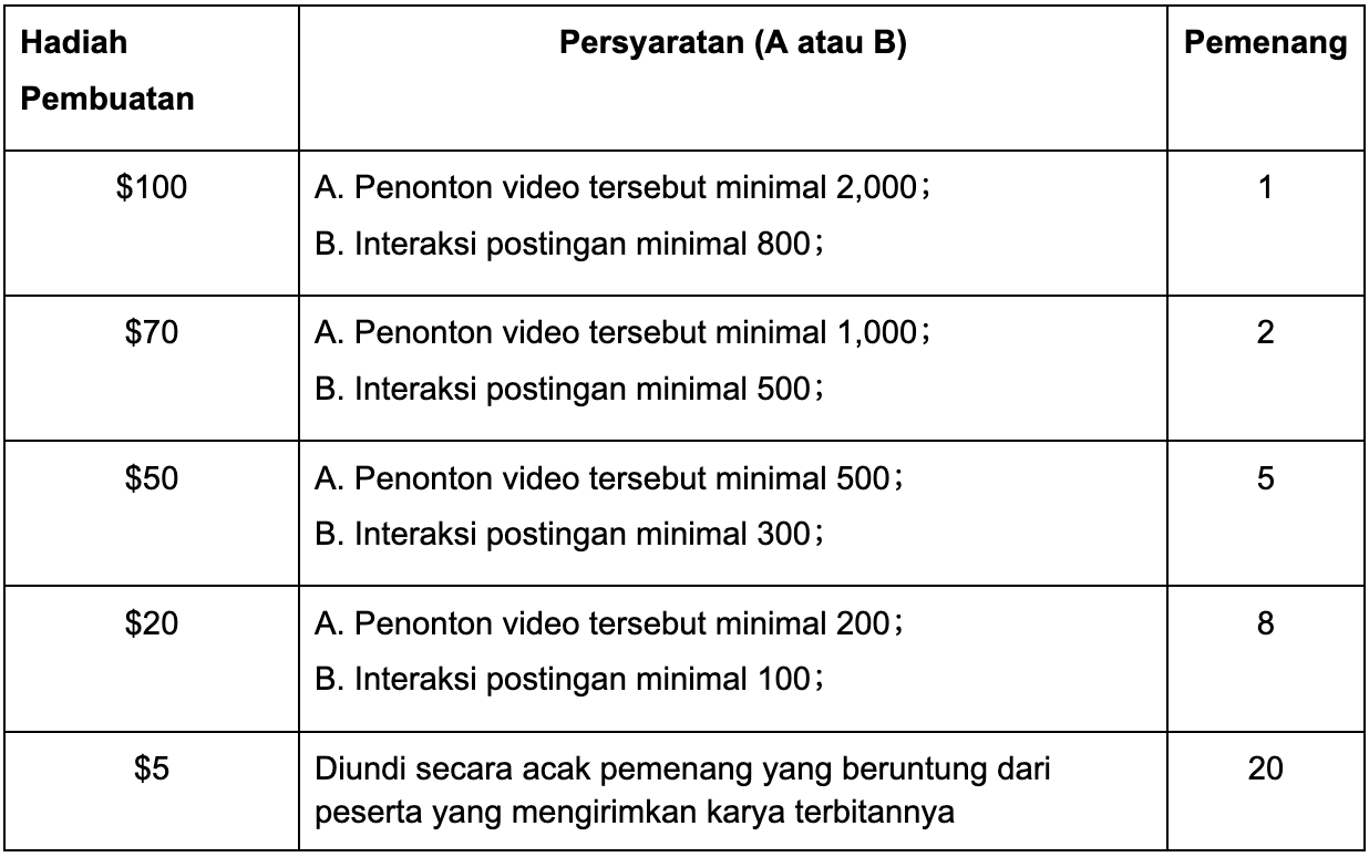 3.Postingan/video yang dipublikasikan akan dievaluasi dalam hal relevansi konten, kreativitas, dan data. Data tersebut harus berupa jumlah penonton, pembagian, komentar, suka, dan sebagainya yang akurat. Data palsu apa pun akan dianggap sebagai perilaku curang.