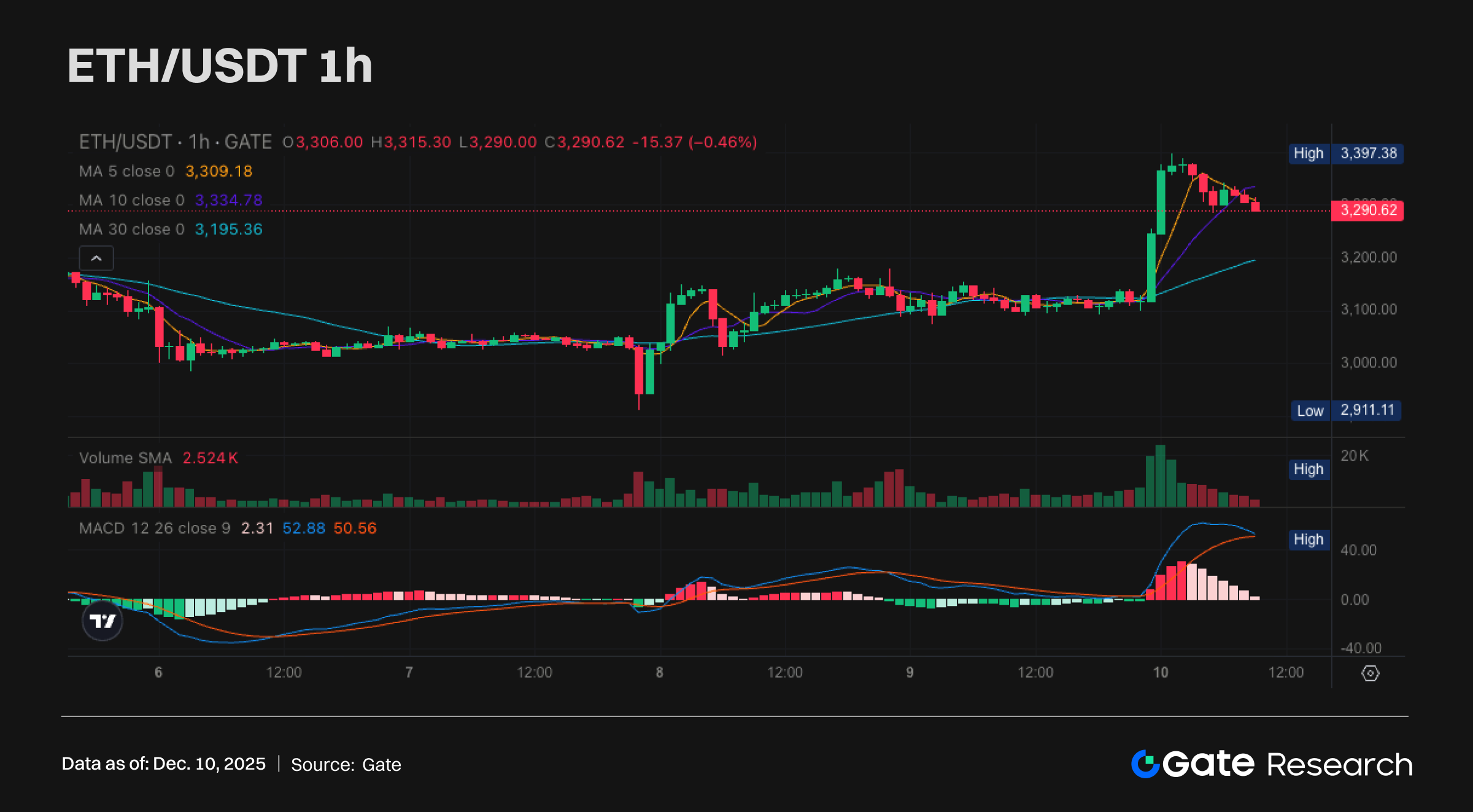 BTC sempat jatuh kembali ke kisaran $92.000 dan melihat asupan pembelian, dan meskipun harga mundur dari level tertinggi $94.500, tetap dalam struktur bullish jangka pendek secara keseluruhan. Dalam hal rata-rata bergerak, MA5 dan MA10 sedikit menelusuri kembali, tetapi masih di atas MA30, menunjukkan bahwa tren belum melemah dan baru memasuki konsolidasi jangka pendek. Bar merah MACD menyatu dari posisi tertinggi, momentum melambat tetapi masih di atas sumbu nol, dan pasar berada dalam fase pendinginan setelah penguatan. Jika BTC dapat menstabilkan zona $91.800–92.200, itu dapat melanjutkan tren perbaikan; Penembusan di bawah MA30 dapat lebih lanjut menguji dukungan $90.500.