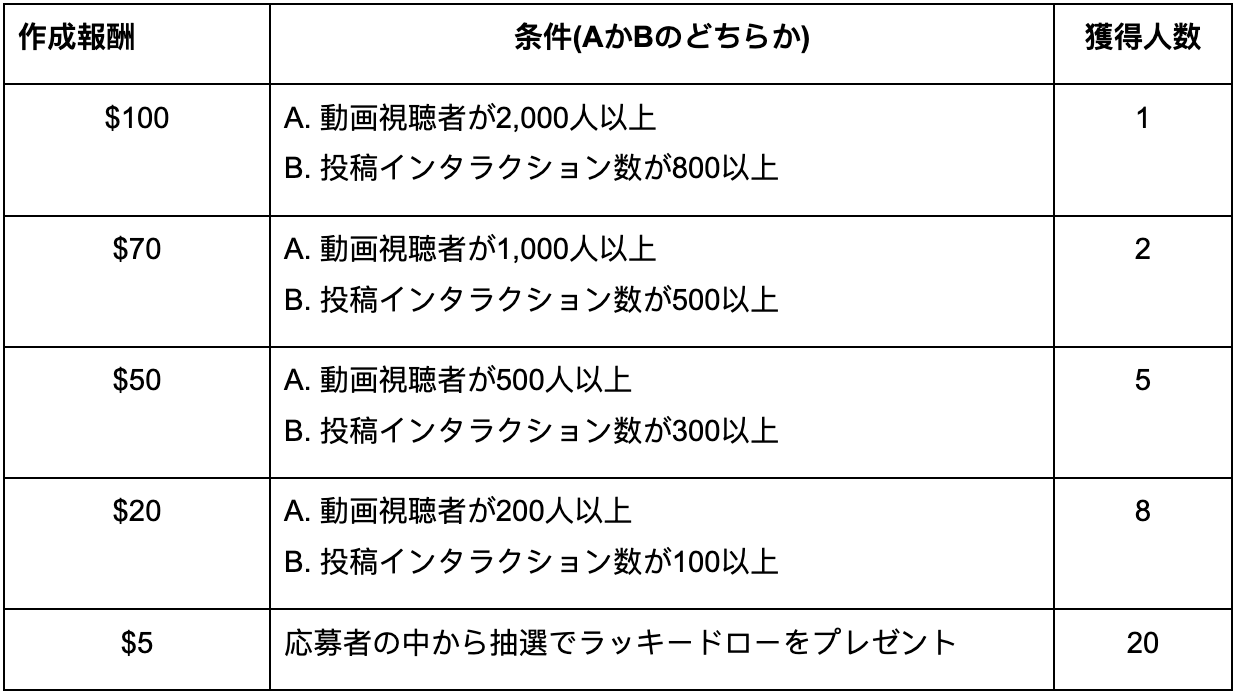 3.公開された投稿/動画は、コンテンツの関連性、創造性、データの観点から評価されます。データは閲覧者数、シェア数、コメント数、いいね数など正確なものとします。データに虚偽がある場合は不正行為とみなされます。