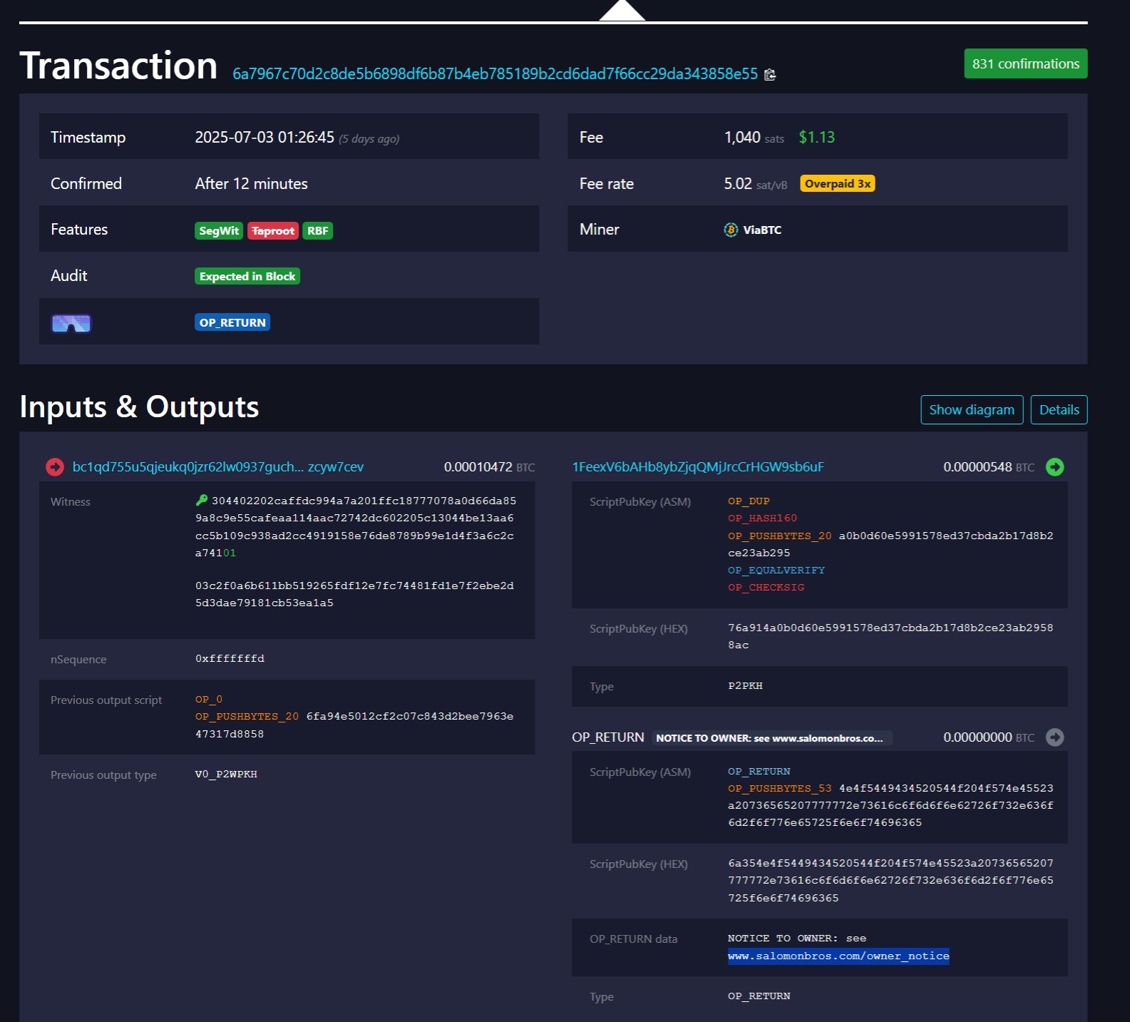 OP_RETURNは、一部のユーザーコミュニティで議論があるものの、ビットコインブロックチェーン上で情報を保存する方法です。この場合、ウォレットに送信される取引には、ウェブサイトのアドレスを表示するテキストが含まれており、所有者にそのページを訪問するよう促しているようです。