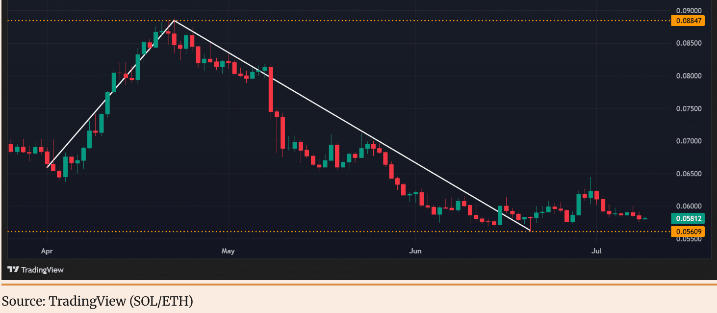 分析アルトコインのビットコインに対するパフォーマンスを行う際、**クロスアセット比率(例えばSOL/ETH)**が非常に重要です。第2四半期のSOL/ETH為替レートの動向は明確な状況を提供しました:
