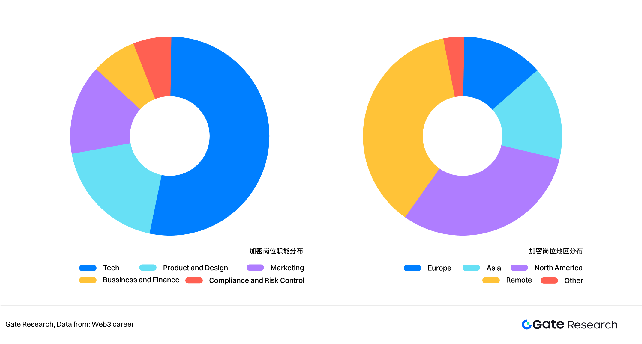 Web3 Careerの統計によると、2025年には世界の暗号業界の職種総数が前年より47%増加し、約66,000の新しい職種に達する見込みです。技術職は引き続き主導的な地位を占めており、その割合は50%を超え、ブロックチェーンの基盤開発、スマートコントラクト、安全監査、システムアーキテクチャなどの分野をカバーしています。一方で、非技術職の増加も顕著で、製品デザイン、マーケティング運営、コンプライアンスとリスク管理の職種の割合が年々上昇しています。これは、暗号業界が初期の技術集約型産業から「技術 + ガバナンス + エコシステムの協調」へと進化していることを示しています。