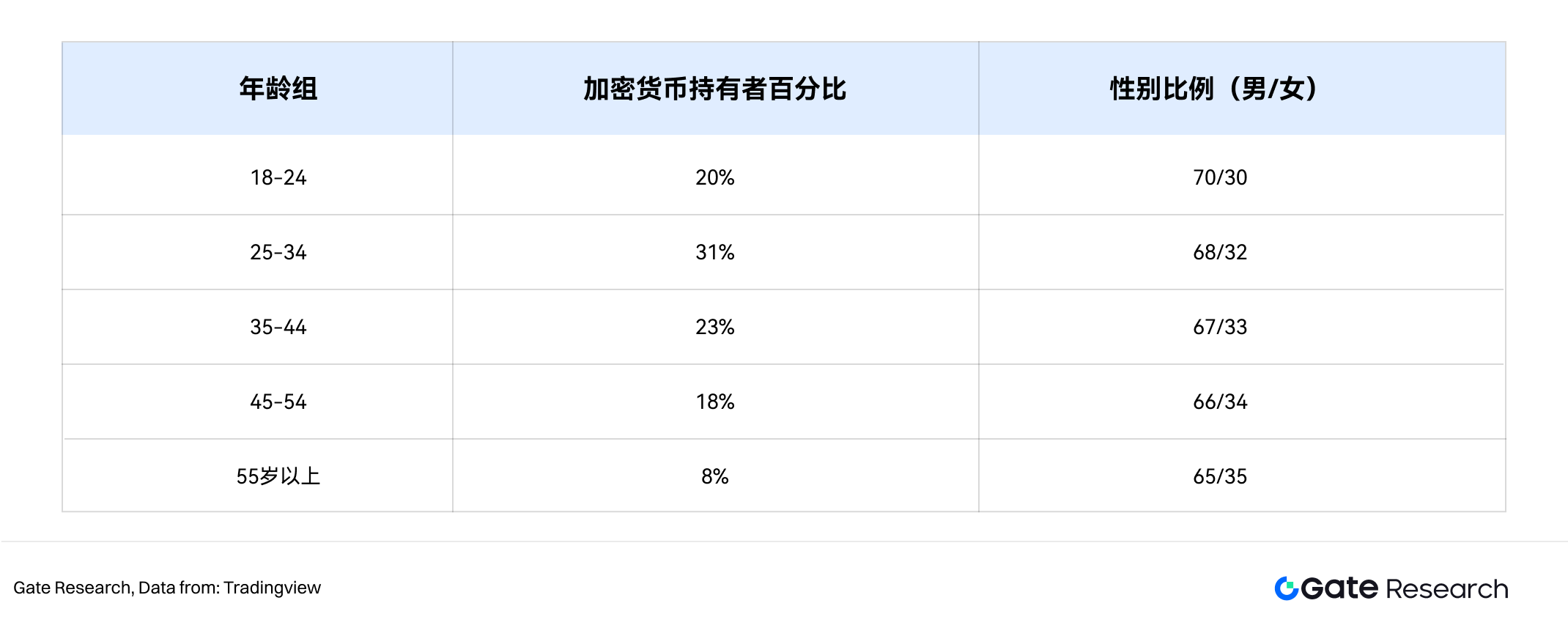 2025年10月までに、世界の暗号通貨ユーザーの総数は9.5億人に達し、世界人口の約9.9%を占めています。ユーザー構造において、25〜34歳の層が31%を占めており、明らかな世代集中性を示しています。この世代のユーザーは、技術の受容度が高く、よりオープンな資産観とグローバルな視野を持っています。彼らはデジタル資産を通じて受動的収益を得ることを好み、分散型金融、NFTエコシステム、GameFiプロジェクトに積極的に参加しています。暗号産業のユーザー年齢分布は明らかに若年化の傾向を示しており、新たな経済形態とデジタルネイティブ文化との高度な適合を反映しています。このグループは一般的に高いデジタルリテラシーと資産配置意識を持ち、Web3の普及を推進する核心的な力となっています。注目すべきは、女性ユーザーの割合が2022年の12%から19%に増加し、業界の包摂度と社会的認識が徐々に改善されていることを示しています。