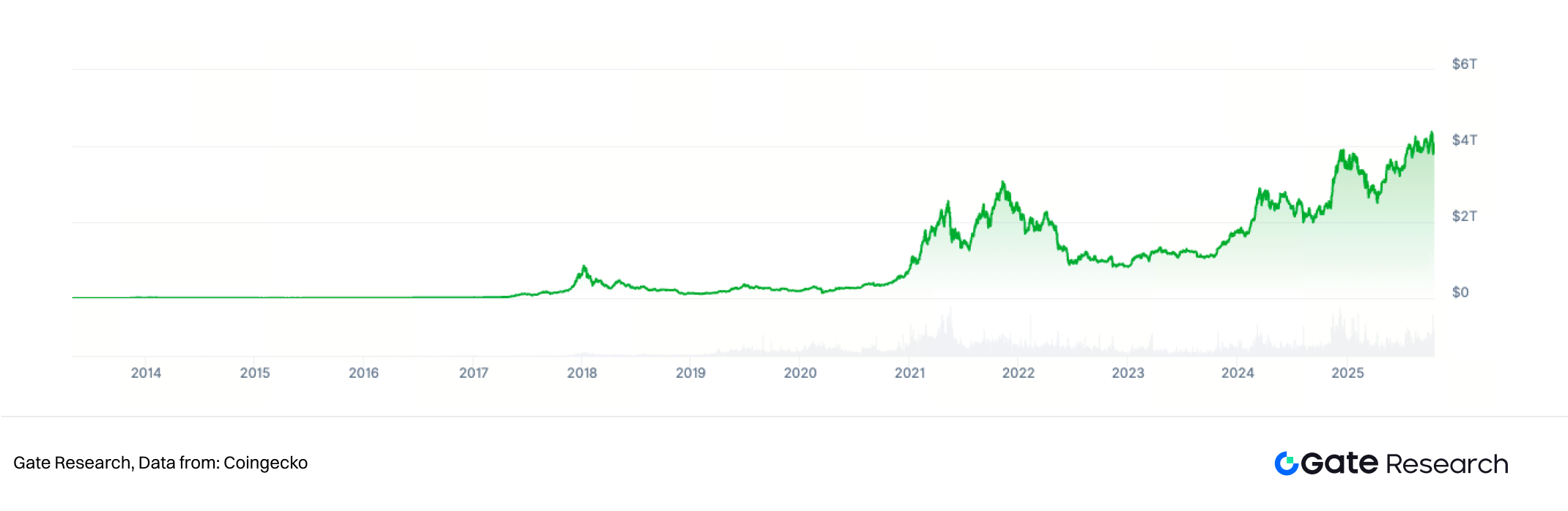 世界経済が広く圧力を受ける中で、暗号業界は依然として強力な成長の勢いを維持しています。2013年以降、業界の時価総額は70億ドルから2025年には3兆ドルを超えるまで成長し、増加率は400倍を超えました。この成長は、技術革新の蓄積を反映するだけでなく、暗号資産に対する市場の長期的な信頼を示しています。CoinGeckoのデータによると、暗号資産の総時価総額は2024年第4四半期に2.8兆ドルを突破し、2025年第2四半期には安定的に上昇し、成熟した市場構造の安定性を示しています。