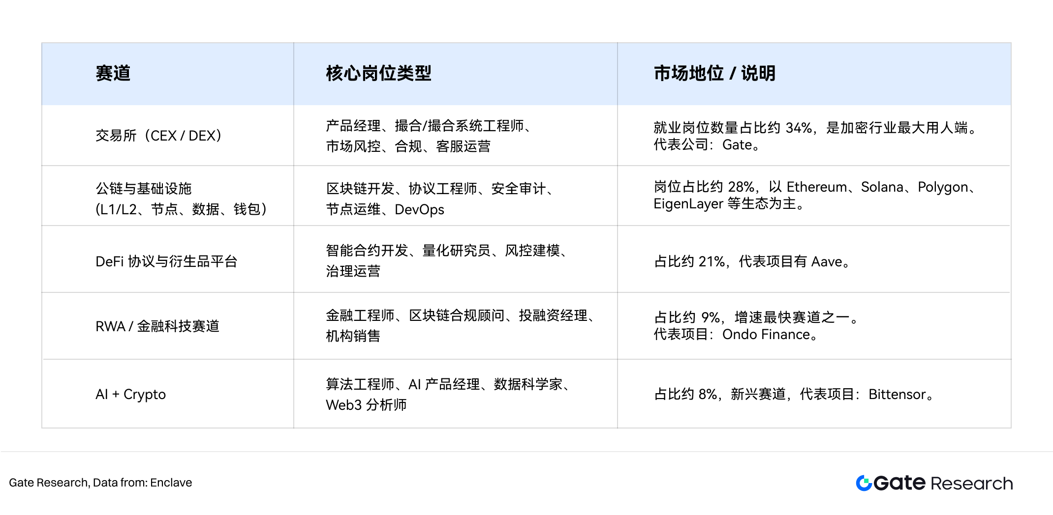 2025年の暗号雇用市場は明らかなトラック分化のパターンを示しています。取引所、公チェーンインフラストラクチャ、DeFiプロトコルが業界の三大コア雇用支柱を構成し、約70%の従業者を吸収しています。web3 Careerのデータによると、取引所のポジションは約34%、公チェーンおよび基盤インフラストラクチャは28%、DeFiプロトコルおよび派生商品プラットフォームは21%を占めています。さらに、RWA(現実世界の資産のオンチェーン化)とAI+Cryptoという2つの新興分野のポジションは約17%を占めていますが、成長速度は最も速く、強い上昇傾向を示しています。