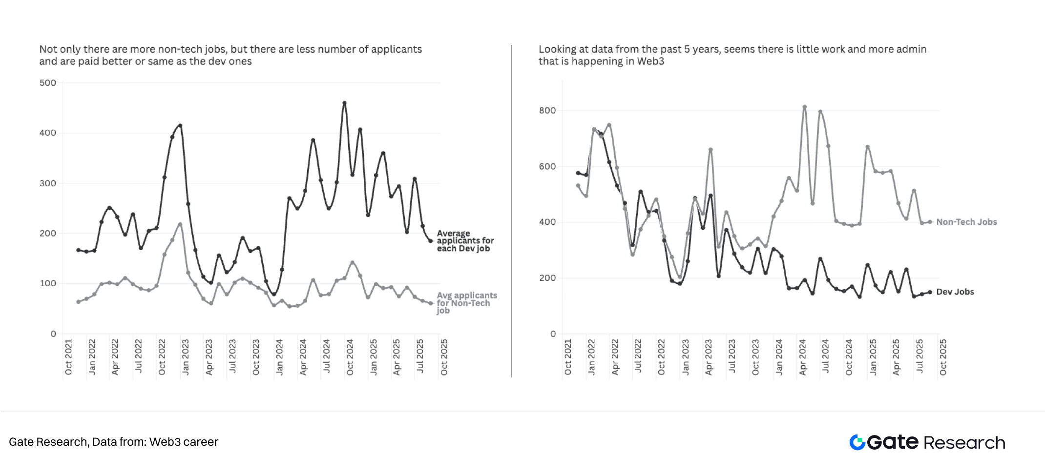 暗号業界の職種数は急速に増加しているが、高度な技術者の不足は依然として顕著である。Coinhub研究所のデータによると、過去2年間において、非技術職の数は持続的に増加し、2024年中頃には開発職の2倍を超えることがあった。しかし、各非技術職の平均応募者数は約80〜120人であり、開発職の200〜400人に比べてはるかに少ない。これは、市場に大量の非技術職(マーケティング、製品、コミュニティ管理など)が出現しているにもかかわらず、高度な技術者が依然として希少な資源であり、競争がさらに激しくなっていることを意味する。