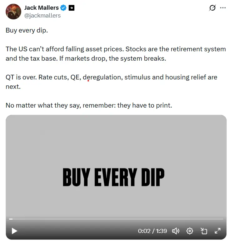 「すべての下落で買え。」これはStrikeのCEO、ジャック・マラーズからのアドバイスです。マラーズによれば、量的引き締めは終わり、利下げと景気刺激策が視野に入る中、「グレートプリント(大規模な資金供給)」がやってくるとのことです。米国は資産価格の下落に耐えられない、と彼は主張し、それが価格を支えるための巨大な流動性の壁となって流れ込むことを意味しています。