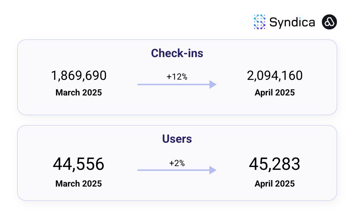 Ambios Networkは、低コストの空気品質および環境センサーを展開することで、リアルタイムかつ超ローカライズされた環境データを提供し、企業、AI、公共サービスをサポートする、世界最大規模の環境監視DePINを構築しました。4月には、Ambios Networkの累計ユーザーエコデータチェックインが200万回を突破し、エコデータチェックイン数は12%増加しました。プラットフォームの総ユーザー数は4.5万人に達し、前年比2%増加しました。