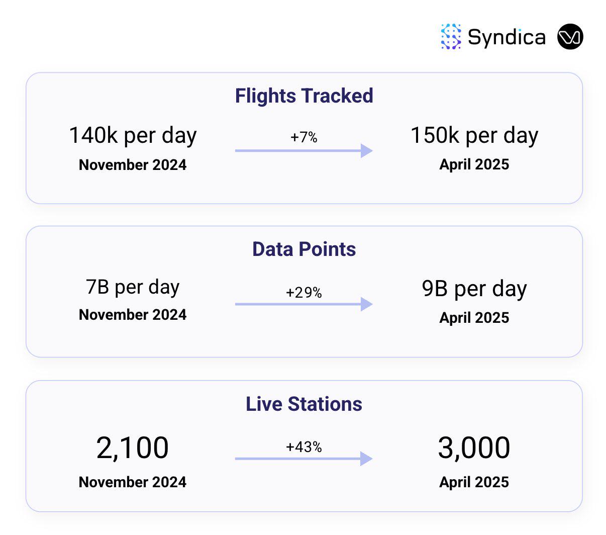 Wingbitsは、Solanaブロックチェーンに基づく分散型物理インフラストラクチャネットワーク(DePIN)プロジェクトであり、世界中のユーザーがデプロイしたADS-Bハードウェアを通じて航空機、ヘリコプター、ドローン、その他の航空機からリアルタイムでデータを収集し、このデータをチェーンにアップロードしてネイティブトークン報酬と引き換えます。 2024 年 11 月以降、Wingbits ネットワークが追跡するフライト数は 150,000 回に増加し、1 日あたりに収集されるデータ ポイントの数は 90 億に増加し、それぞれ 7% と 29% 増加しました。 寄稿サイトの数も43%増加して3,000になりました。
