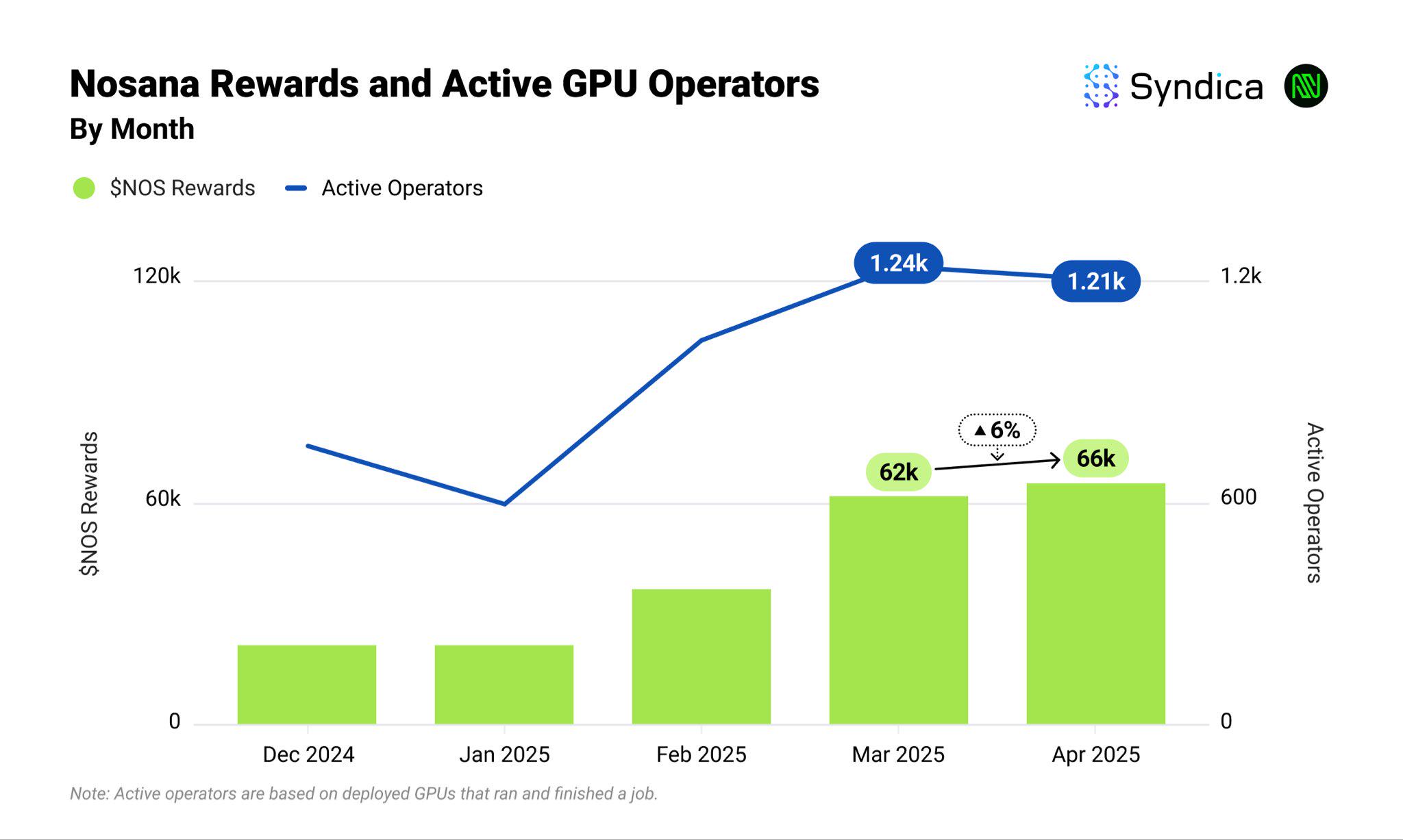 Nosanaは、Solanaブロックチェーン上に構築された分散型GPUコンピューティングネットワークで、AI推論ワークロードのための分散型コンピューティングマーケットプレイスを提供することに重点を置いています。 4月には、Nosanaのジョブが完了しました(Nosanaネットワークでは、AIクライアントが推論リクエストを送信するたびに、ネットワークはリクエストを1つ以上のGPUノードに割り当てて実行します。 計算の開始から結果(「ジョブ」と呼ばれる)とコントリビューター報酬の返還までのこのリクエストの全プロセスはわずかに増加し、GPUノードは安定したままです。 新たに開始されたGaianet AIコラボレーションプロジェクトにより、AIエージェントはNosanaインフラストラクチャ上で実行したり、雇用の増加を促進したりできます。